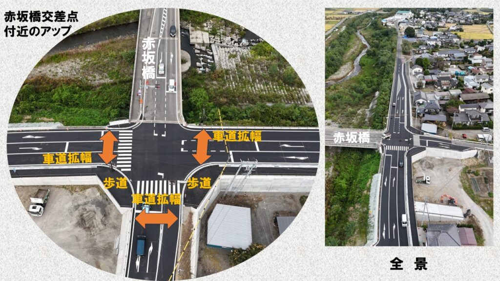 10月第1週で工事はおおよそ完成となりました。ドローン写真は完成した道路全体像となります。大きく変わりました点は、道路幅員の拡張で交差点4方向で右折レーンの追加、歩道と横断の待機場所の増設となります。長い間交通規制による不自由をお掛けしましたが、おかげさまで完成する事が出来ました。ご協力頂きました方々に感謝いたします。